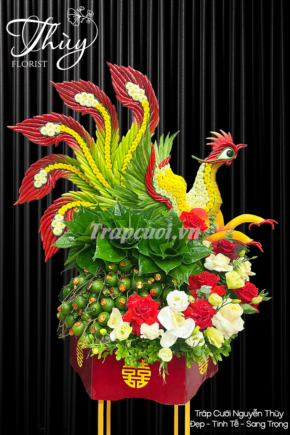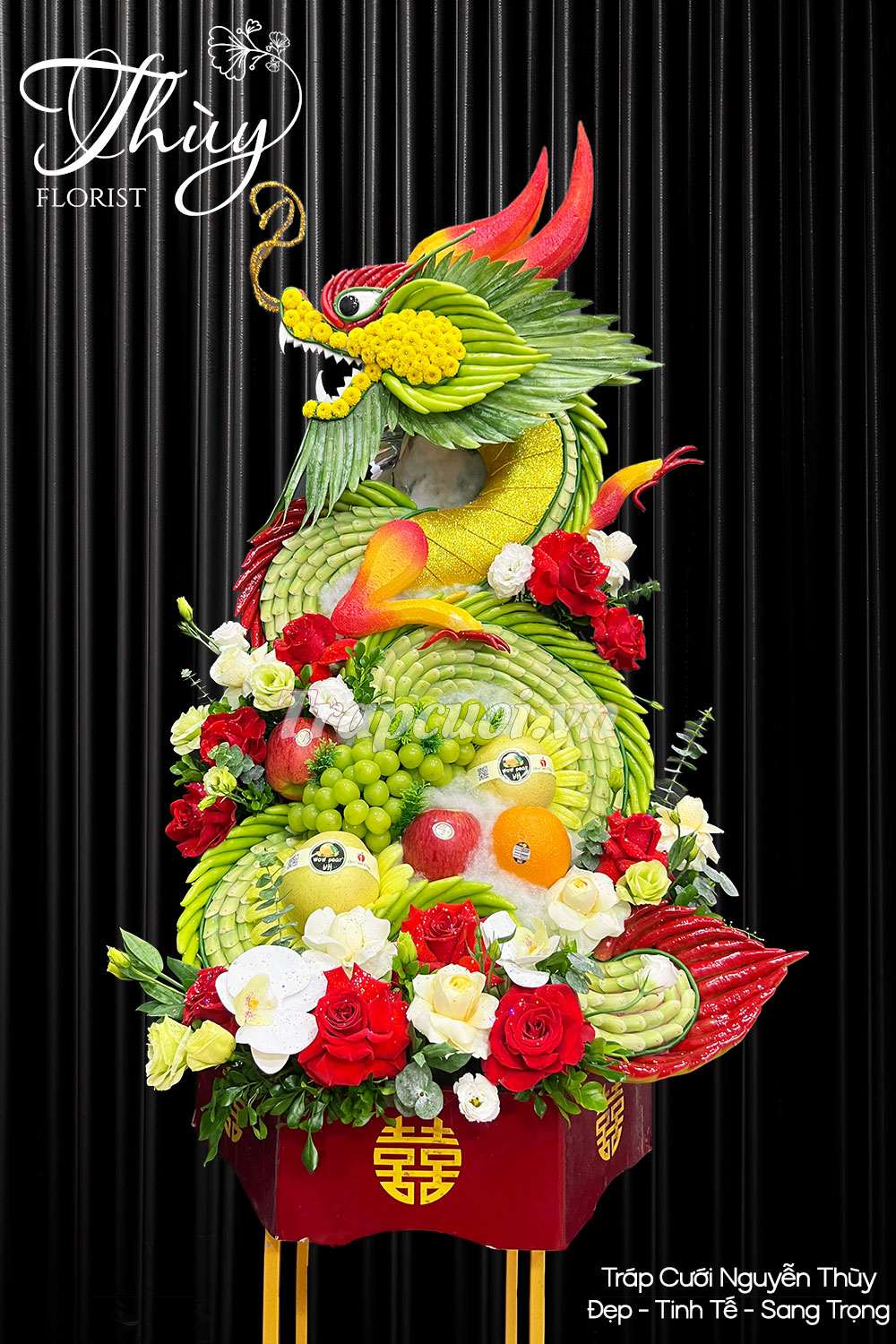 Tráp hoa quả được kết hình rồng hoặc trang trí nghệ thuật, tượng trưng cho sự sung túc và mong muốn cuộc sống hôn nhân đủ đầy.
