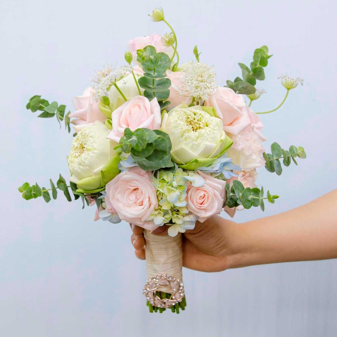 Bó hoa cưới hồng kem nhẹ nhàng, mang vẻ đẹp cổ điển, thanh lịch – lựa chọn hoàn hảo cho cô dâu yêu phong cách vintage. Thiết kế bởi Tráp Cưới Nguyễn Thùy.