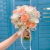 Thiết kế đơn giản nhưng không hề đơn điệu, bó hoa là bản giao hòa tuyệt vời giữa những cánh hoa cam pastel mềm mại, xen kẽ lá phụ và phụ kiện nhẹ nhàng. Phù hợp với những tiệc cưới mang phong cách tối giản, ngoài trời hay rustic hiện đại.