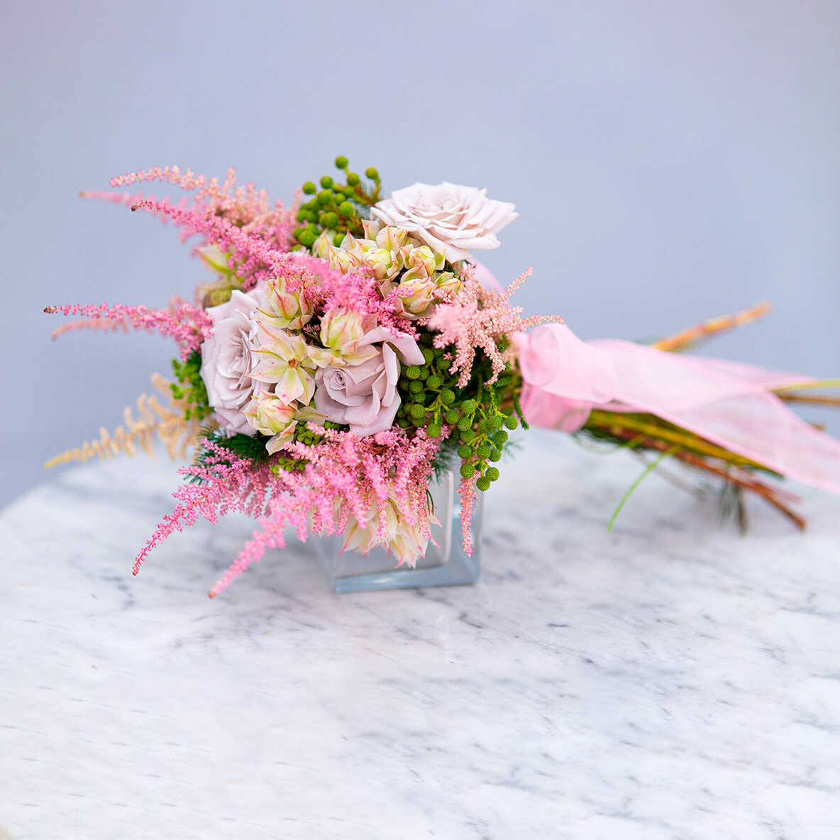 Sắc hồng pastel dịu dàng – đại diện cho tình yêu trong trẻo và ngọt ngào – được phối tinh tế cùng phụ kiện cỏ mềm mại, tạo nên một tổng thể bay bổng, mộc mạc mà vẫn thời thượng. Bó hoa gợi cảm giác như một bản tình ca mùa xuân, nhẹ nhàng và sâu lắng, làm nổi bật hình ảnh cô dâu dịu dàng, nữ tính và đầy cuốn hút.